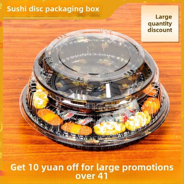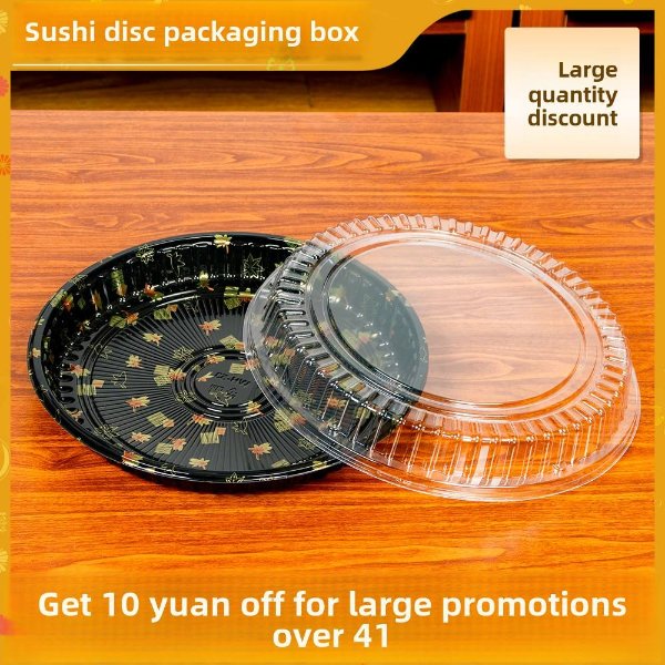 High-End Disposable Plastic Sushi Takeout Box Trendy Printed round Packaging for Salmon Sashimi Large Plate with Lid